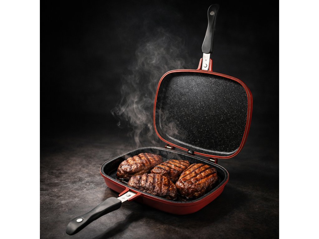 Bachmayer Obojstranná otočná grilovacia panvica je ten pravý kúsok, ktorý oživí vašu kuchyňu a uľahčí prípravu obľúbených grilovaných pokrmov. Táto dvojitá grilovacia panvica s inovatívnym dizajnom vám umožní variť bez chaosu – zamykateľná konštrukcia ochráni váš varič pred prskajúcim tukom a mäso otočíte jedným plynulým pohybom, bez akejkoľvek stierky. Vďaka indukčnému dnu na oboch stranách ju použijete na akomkoľvek sporáku, čo je skvelé pre každú modernú domácnosť. Navyše umožňuje prípravu jedál s minimom tuku, takže vaše pokrmy budú nielen chutné, ale aj zdravšie. Dva druhy povrchu – hladký na vyprážanie a reliéfny ako grilovací rošt – nahradia dve samostatné panvice.