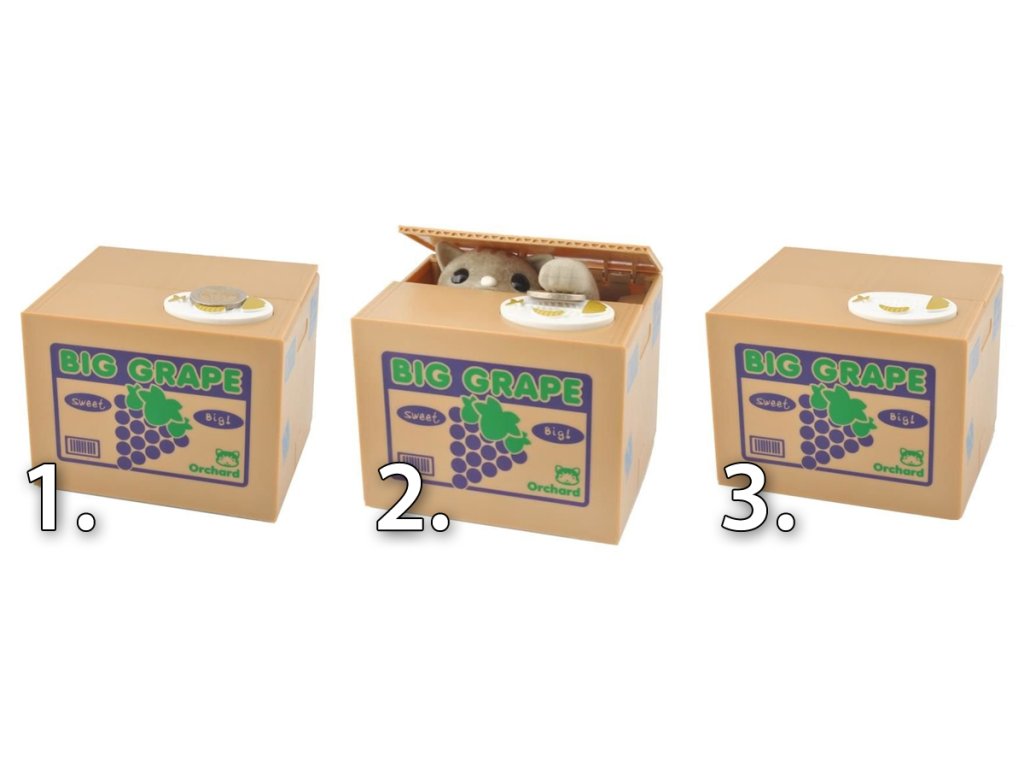 Stačí vložiť mincu na určené miesto interaktívnej hračky, mierne stlačiť gombík, potom sa zdvihne veko škatule a z vnútra sa objaví mačiatko a siahne po minci s labkou. V tomto okamihu minca spadne do krabice.