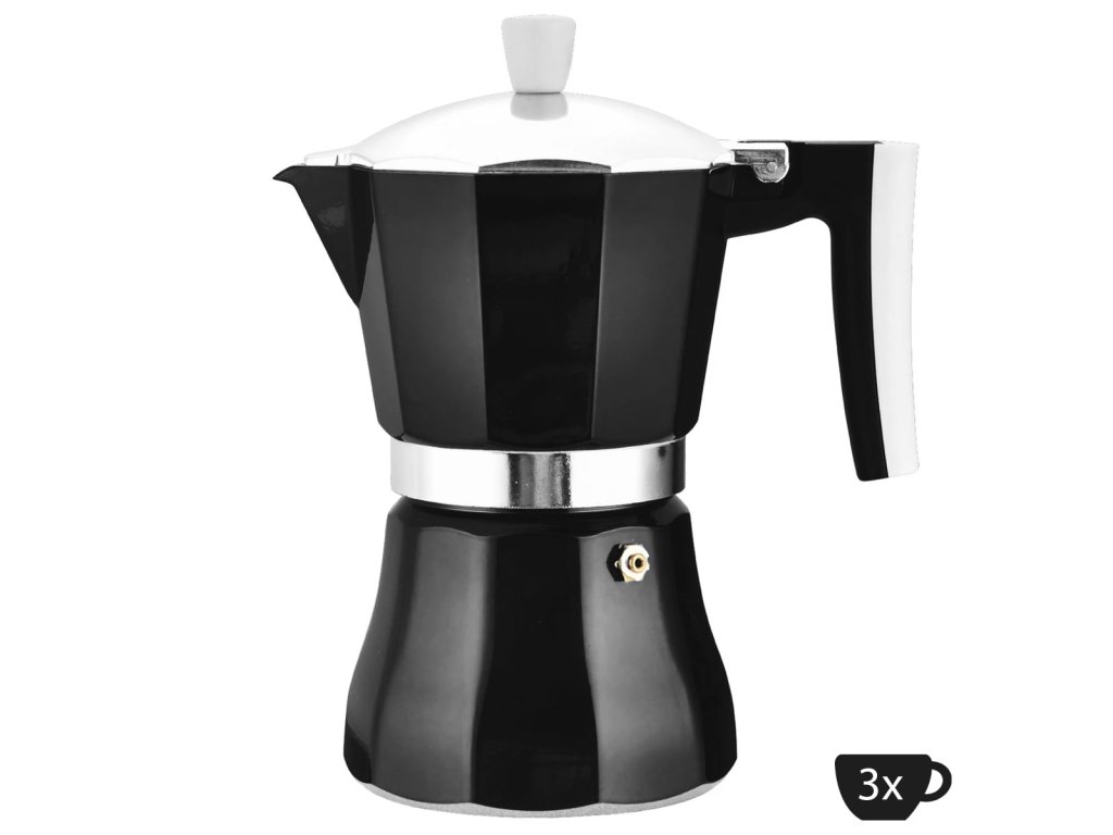 Indukčný moka kávovar 3 šálky Perfect Home Azzurro 16662 v čiernej farbe. Hliníková kanvica s plastovou rukoväťou pripraví 150 ml aromatickej kávy na indukcii, plyne, elektrike aj keramike. Ľahká údržba.