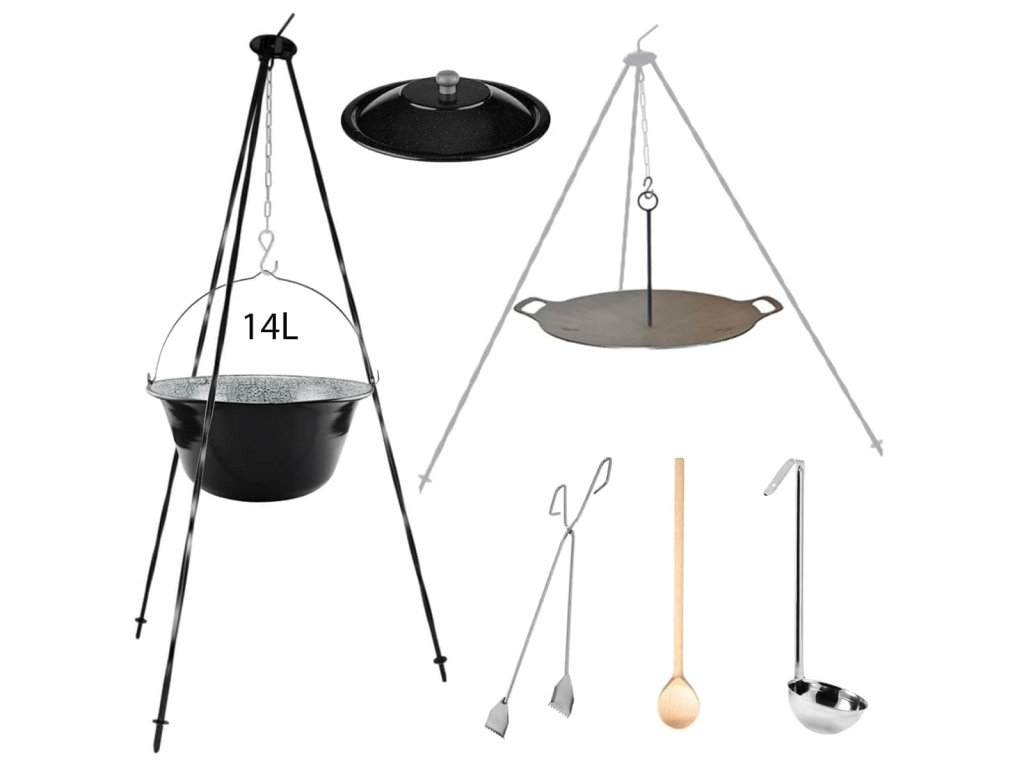 | Obsah sady: | kotlík, pokrievka, varecha, trojnožka, naberačka, grilovacia platňa, grilovacie kliešte |