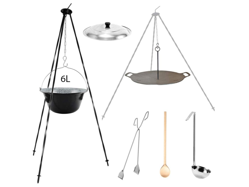 | Obsah sady: | kotlík, pokrievka, varecha, trojnožka, naberačka, grilovacia platňa, grilovacie kliešte |
