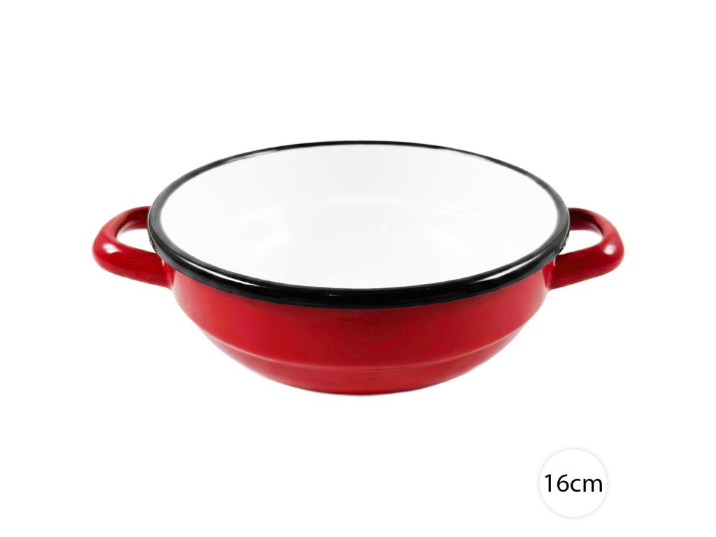 Táto smaltovaná miska s priemerom 16 cm, známa aj ako selská miska, spája tradičný dizajn, vysokú odolnosť a praktickosť. Elegantná červená vonkajšia farba a čisté biele vnútro pôsobia štýlovo na každom stole – či už doma, na chate alebo v reštaurácii. Smalt kombinuje pevnosť kovu s hygienickým hladkým skleneným povrchom, vďaka čomu je miska ideálna nielen na servírovanie, ale aj na prípravu jedál a odolá každodennému používaniu. Je vhodná na polievky, guláš, omáčky, kapustnicu, ale aj na krutóny, prílohy či drobné občerstvenie. Skvele sa hodí aj na miešanie vajec, krémov alebo omáčok a drobné prípravné práce pri varení. Odolný smaltovaný povrch neviaže pachy a ľahko sa čistí. Miska sa pohodlne drží a je prispôsobená jednoduchému servírovaniu, takže je ideálna aj do štýlových prevádzok s tradičnou či rustikálnou atmosférou.