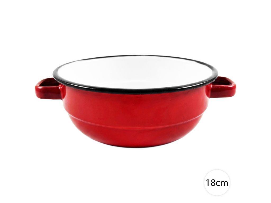 Táto smaltovaná miska s priemerom 18 cm, známa aj ako selská miska, spája tradičný dizajn, vysokú odolnosť a praktickosť. Elegantná červená vonkajšia farba a čisté biele vnútro pôsobia štýlovo na každom stole – či už doma, na chate alebo v reštaurácii. Smalt kombinuje pevnosť kovu s hygienickým hladkým skleneným povrchom, vďaka čomu je miska ideálna nielen na servírovanie, ale aj na prípravu jedál a odolá každodennému používaniu. Je vhodná na polievky, guláš, omáčky, kapustnicu, ale aj na krutóny, prílohy či drobné občerstvenie. Skvele sa hodí aj na miešanie vajec, krémov alebo omáčok a drobné prípravné práce pri varení. Odolný smaltovaný povrch neviaže pachy a ľahko sa čistí. Miska sa pohodlne drží a je prispôsobená jednoduchému servírovaniu, takže je ideálna aj do štýlových prevádzok s tradičnou či rustikálnou atmosférou.