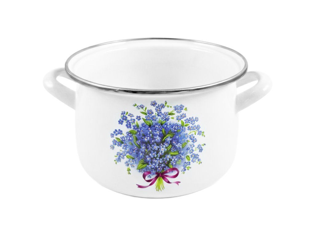 - Farby: hrniec biely s potlačou nezábudiek, vnútro biele; pokrievka svetlomodrá z oboch strán, nerezový lem