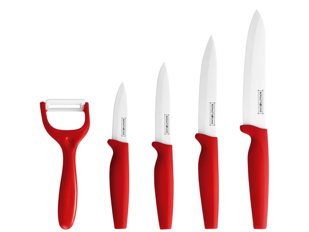 5 dielna súprava nožov s keramickým povrchom Royalty Line RL-C4R. Vysoko kvalitné kuchynské nerezové nože s čepeľami so špeciálnou antibakteriálnou povrchovou vrstvou a keramickou škrabkou. Veľmi ľahké nože s praktickou protišmykovou ergonomickou plastovou rukoväťou. Nože sú šetrné k potravinám a čepele ostávajú veľmi dlho ostré. Nevhodné do umývačky riadu.